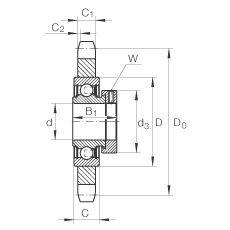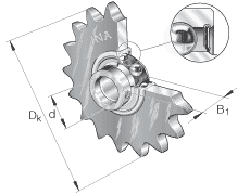 • 鏈傳動惰輪輪齒單元作為組合型號的例子 KSR15-B0-06-10-20-08 KSR 鏈傳動惰輪輪齒單元 15 軸承內徑 B0 帶偏心套的外球面球軸承, 系列 RAE..-NPP 06 惰輪節圓 1/16